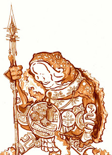 As they traveled north, they passed into an area of man-made corridors, the floors and walls covered with stone tiles. They found an unusual doorway, one decorated with images of ants and a woman with the lower body of an ant. They decided this must be the shrine, and prepared to enter. Archibald the thief recognized that one of the tiles had a false surface, and underneath was a bear trap. It took him several tries with his crowbar to trigger it safely.